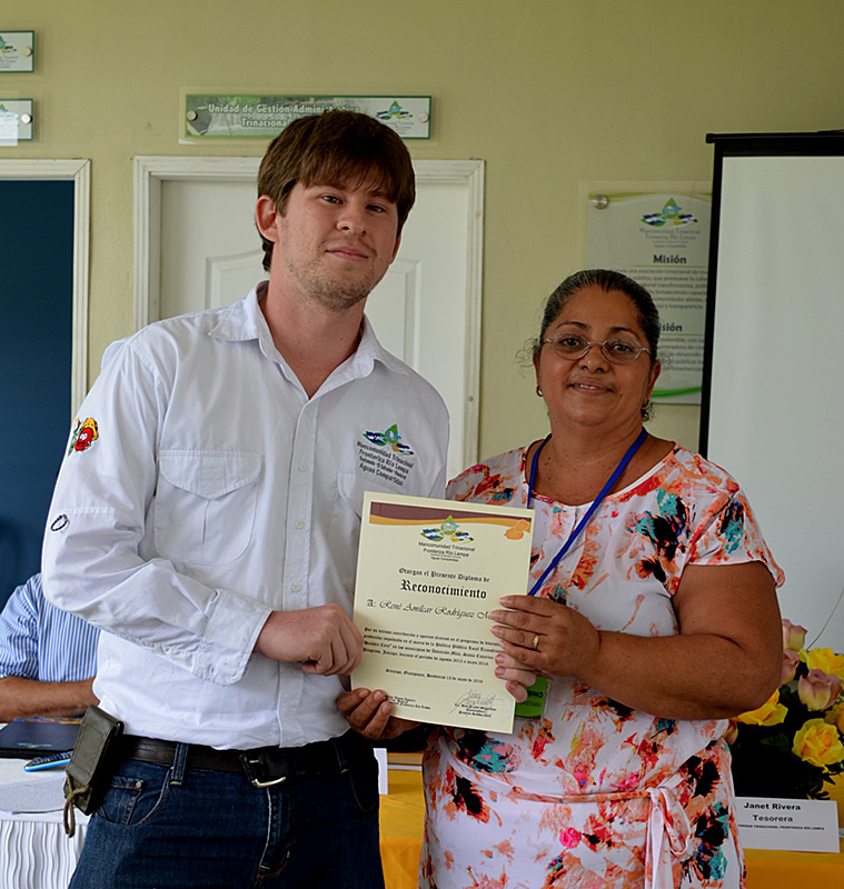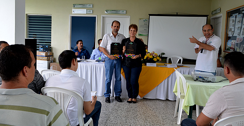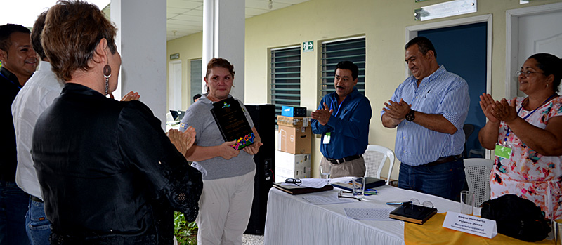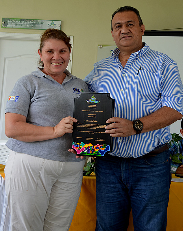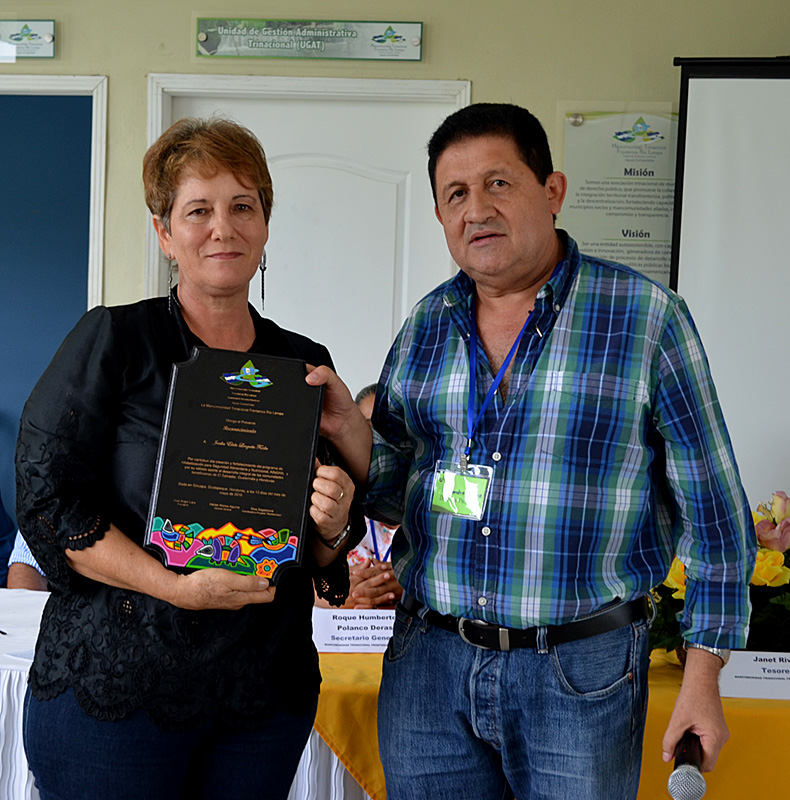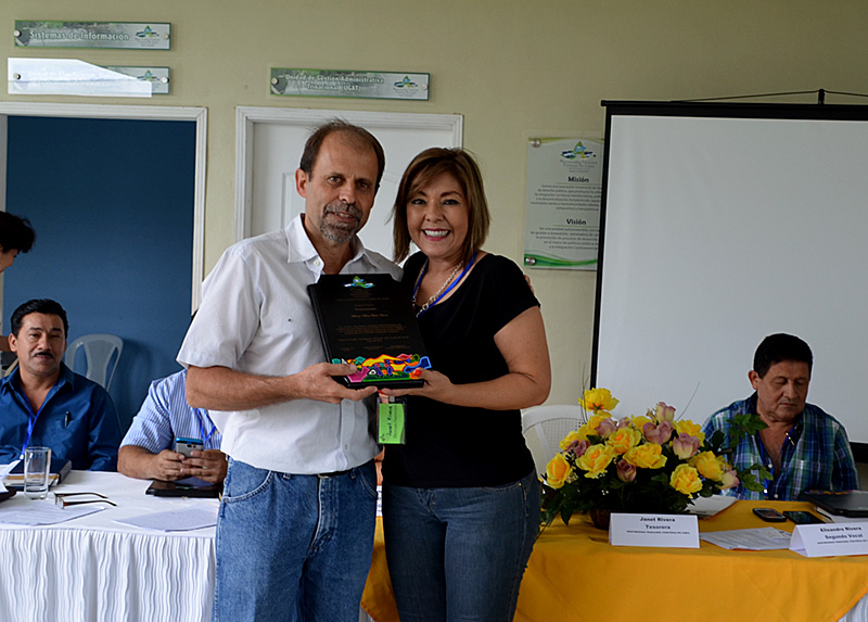 En ese mismo sentido, la representante de PRESANCA II, María Julia Medina, recibió una placa de reconocimiento por su total apoyo a AlfaSAN y al programa de Aguas Compartidas, ya que su compromiso personal hizo posible que dicha agencia de cooperación siga auspiciando ambas políticas públicas. Asimismo, el técnico de la Mancomunidad René Rodríguez, recibió un diploma de reconocimiento por su aporte personal en su período de prácticas académicas en nuestra institución.