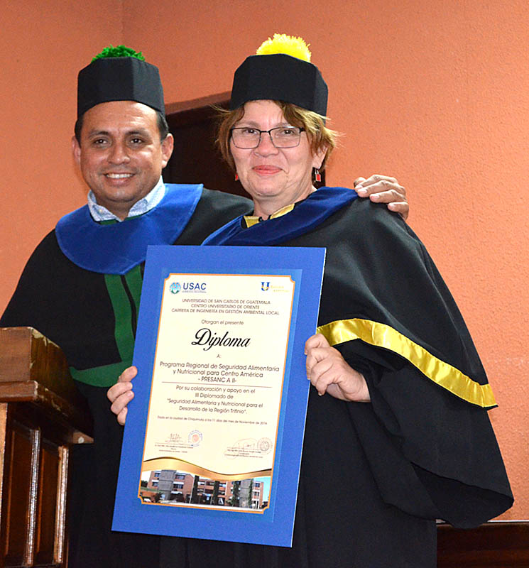 Los 25 nuevos técnicos en Seguridad Alimentaria y Nutricional, SAN, vestían sus mejores galas en las instalaciones del Centro Universitario de Oriente de la Universidad de San Carlos, CUNORI-SC; “en este tercer diplomado tenemos técnicos de los tres países, eso es bueno porque estamos formando nuevos colaboradores que egresan con la misma calidad académica de nuestras carreras oficiales”, expresa Ramiro García, Coordinador de la Carrera de Ingeniería en Gestión Ambiental, del CUNORI-SC.