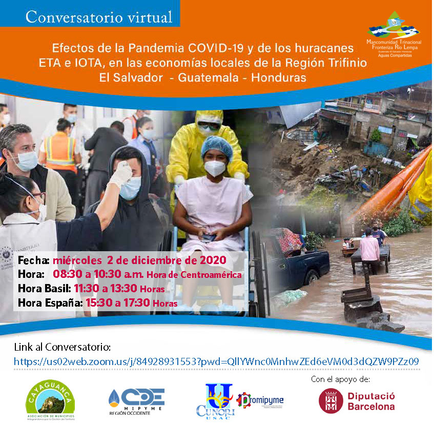 La Mancomunidad Trinacional Fronteriza Río Lempa invita a participar del Conversatorio Virtual "Efectos de la Pandemia COVID-19 y de los huracanes ETA e IOTA, en las economías locales de la Región Trifinio, El Salvador, Guatemala, Honduras"