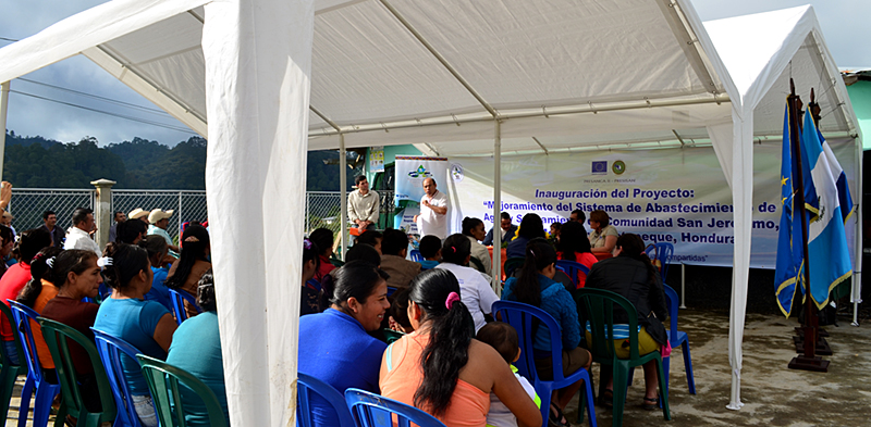 Ante más de 76 familias beneficiarias, Chacón, también residente de dicha aldea, recordó a sus paisanos los innumerables proyectos de agua que no funcionaron, “como Alcalde y también como vecino de San Jerónimo, queremos agradecer a la Mancomunidad Trinacional y a PRESANCA II, por apoyarnos en el rediseño de la carpeta técnica, en la dirección y ejecución, a través de sus técnicos, quienes supervisaron, y pese a todos los problemas, éstos fueron superados hasta llegar a feliz término, para inaugurar el sistema de agua potable que hoy beneficiará a todas las familias de esta aldea”; detalló.