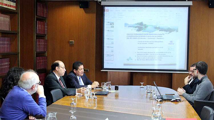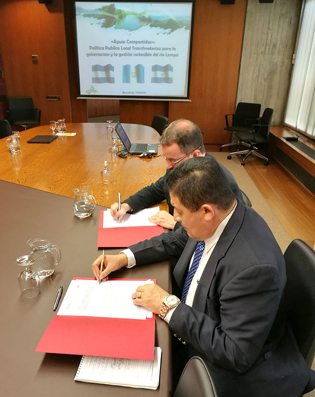 Barcelona, Cataluña, 18 de Noviembre de 2016. La tercera fase del proyecto:"Aguas compartidas. Gestión urbana para el manejo integral de los recursos hídricos en el Trifinio Centroamericano” fue firmado hoy en un convenio de financiamiento por Alfred Bosh, Vicepresidente del Área Metropolitana de Barcelona, AMB, con el alcalde Elisandro León Rivera, Presidente de la Mancomunidad Trinacional.