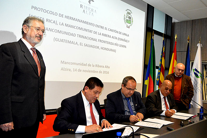 Valencia, España, 14 de Noviembre de 2016. La Mancomunidad Trinacional firmo hoy, un convenio de hermanamiento con la Mancomunidad de la Rivera Alta de Valencia, España y con el municipio Upala de Alajuela, Costa Rica, con el fin de fortalecer las capacidades institucionales de las entidades involucradas e implementación de políticas locales sectoriales en cada una de las regiones de España y Centroamérica.