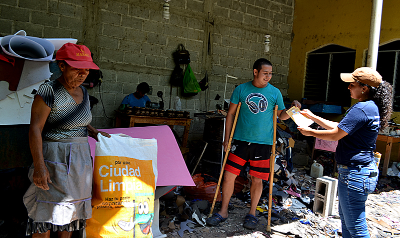 “Es un reto, estoy trabajando para provocar un cambio en mi municipio, que la población deje esa actitud de botar la basura en cualquier lugar, con la Política Pública - Ciudad Limpia- que impulsa la Alcaldía y la Trinacional, estamos educando para que depositen la basura en su lugar respectivo y que la separen, así tendremos limpia nuestra ciudad, evitamos la contaminación y generamos fuentes de trabajo”. Explica Karen, mientras entrega una hoja volante al administrador de una fábrica de confección de zapatos, la cual es parte de la campaña ejecutada entre Alcaldía y la Trinacional.