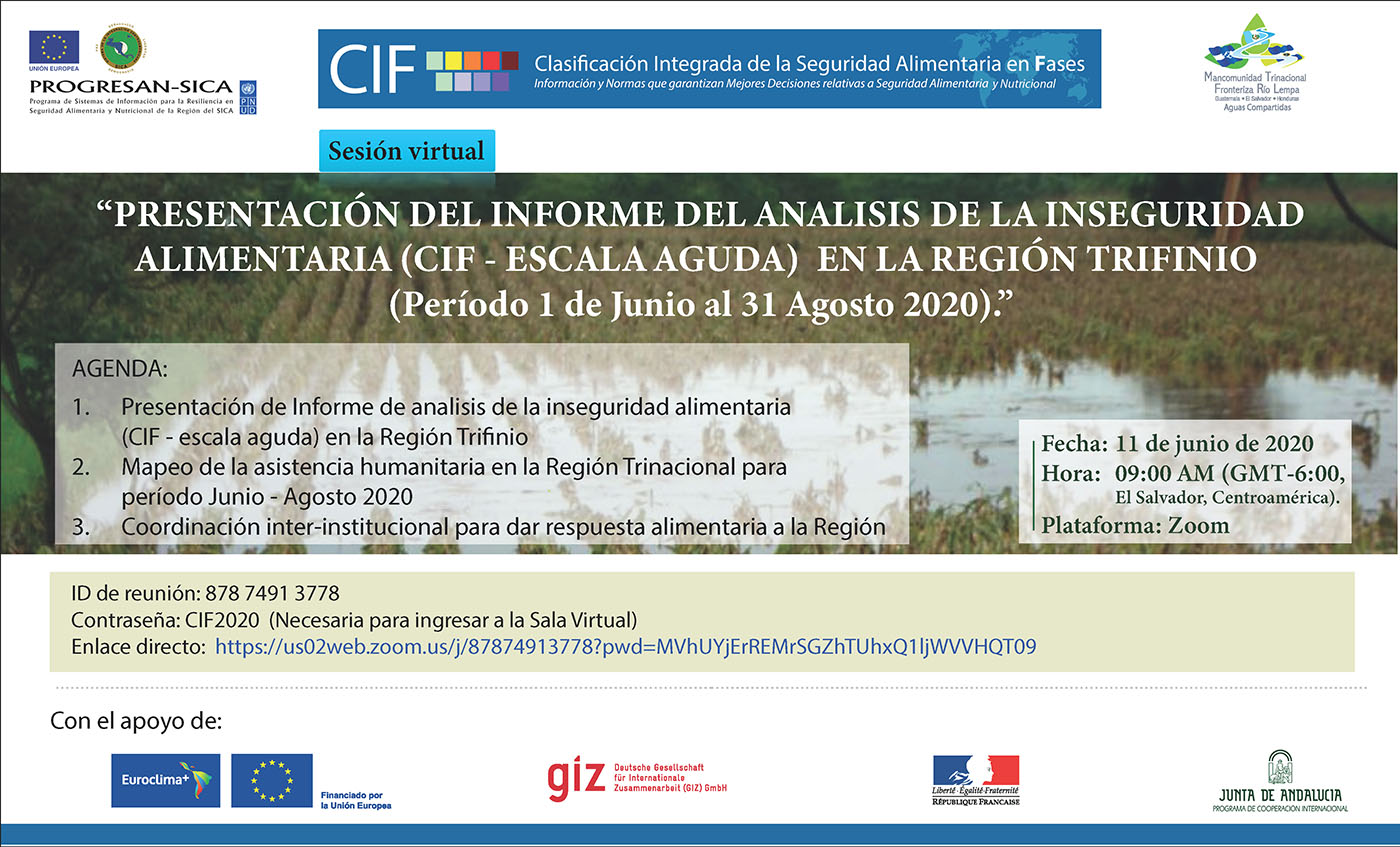 En función de lo expuesto, por este medio le hacemos una atenta invitación para que nos acompañe en la presentación virtual de los resultados del Cuarto Informe de Análisis para la Clasificación Integrada de la Seguridad Alimentaria en Fases, Inseguridad Alimentaria Aguda de la en la Región Trifinio (Período 1 de junio al 31 de agosto del 2020) y la coordinación de acciones inter – institucionales para atender la emergencia, evento que se llevará a cabo, según el siguiente detalle: