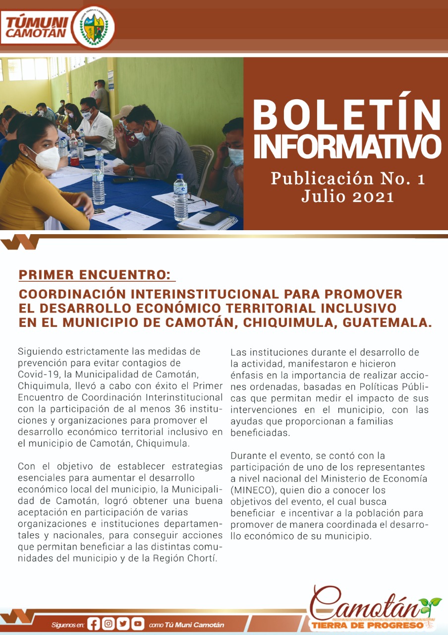 Camotan, Chiquimula, Guatemala, Julio 2021. Siguiendo estrictamente las medidas de prevención para evitar contagios de Covid-19, la Municipalidad de Camotán, Chiquimula, llevó a cabo con éxito el Primer Encuentro de Coordinación lnterinstitucional con la participación de al menos 36 instituciones y organizaciones para promover el desarrollo económico territorial inclusivo en el municipio de Camotán, Chiquimula.