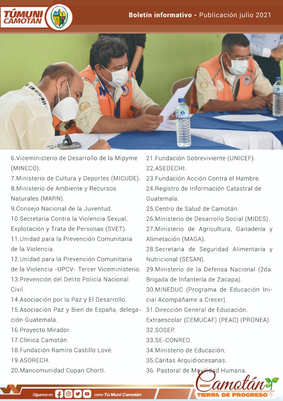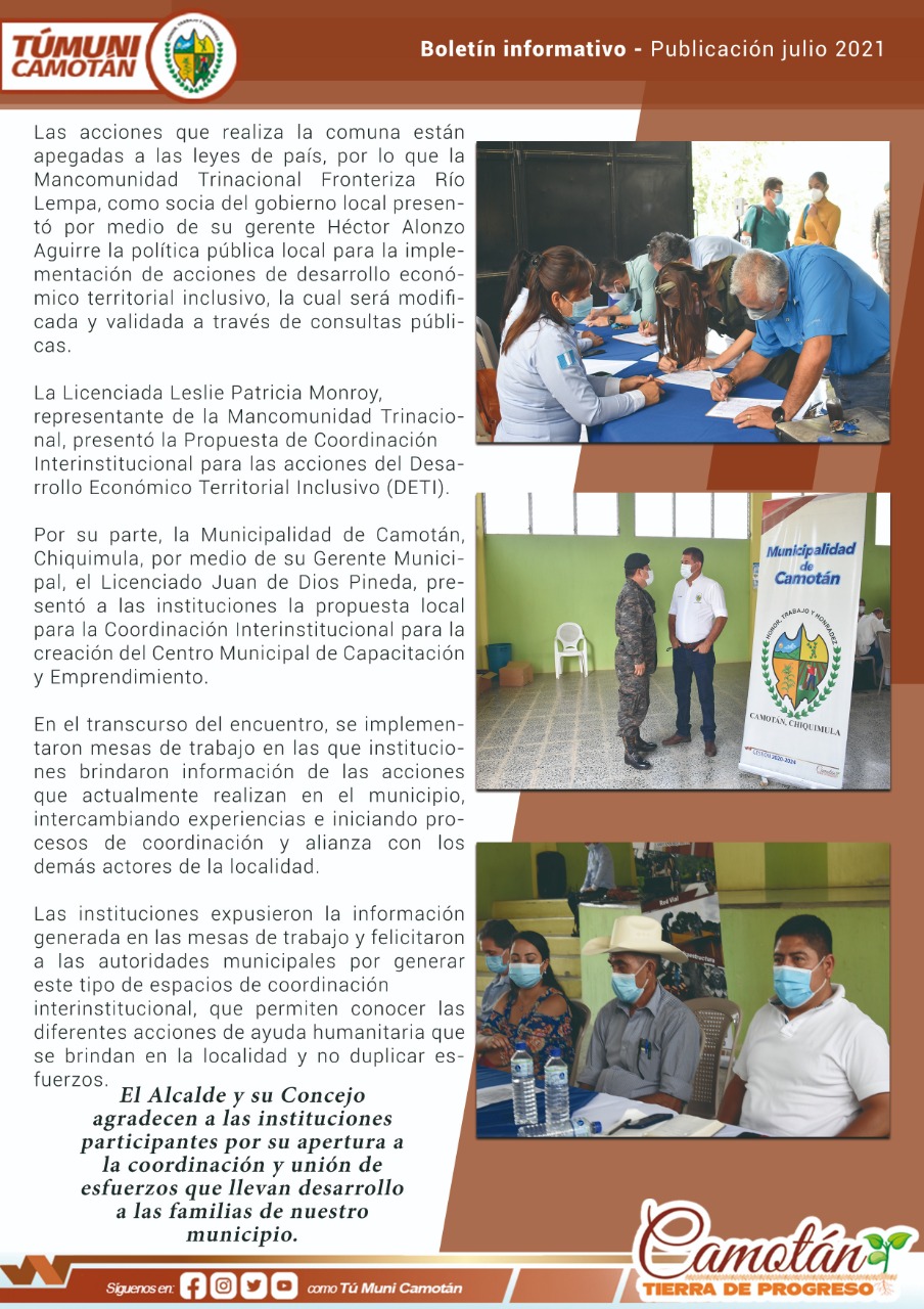 - La Municipalidad de Camotán convocará a las Instituciones sociales benéficas que realicen acciones en el municipio para realizar una mesa técnica y analizar la unión de esfuerzos para la apertura de Centro Municipal de Capacitaciones y Emprendimiento.
