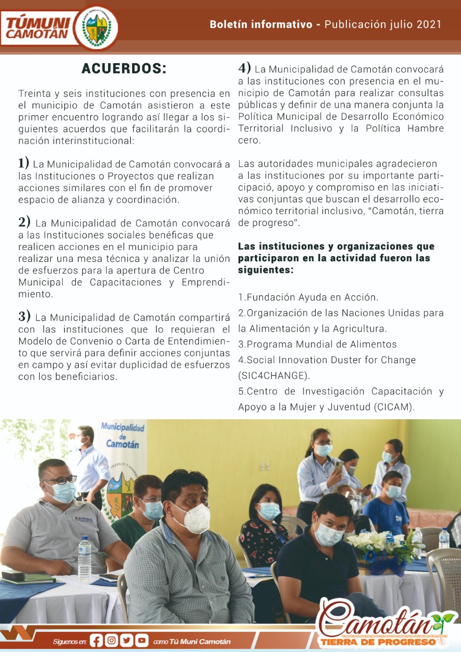 - La Municipalidad de Camotán convocará a las instituciones con presencia en el municipio de Camotán para realizar consultas públicas y definir de una manera conjunta la Política Municipal de Desarrollo Económico Territorial Inclusivo y la Política Hambre cero.