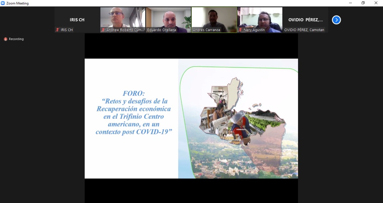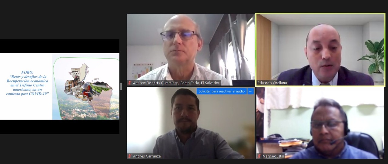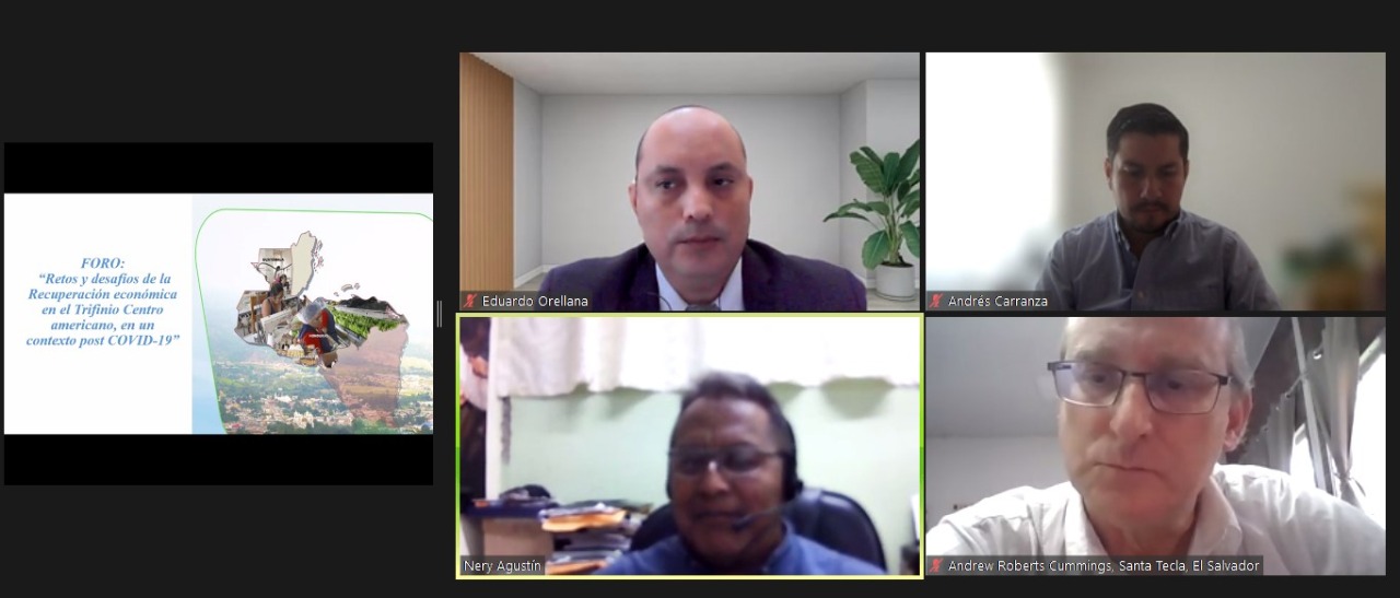 Posterior al acto de inauguración, se desarrolló un importante foro denominado “Retos y desafíos de la Recuperación económica en el Trifinio Centro americano, en un contexto post COVID-19” el cual contó con la valiosa participación de PhD. Andrew Roberts Cummings, Lic. Andrés Carranza, PhD. Nery Agustín, como panelistas y del Lic. Eduardo Orellana, como moderador.