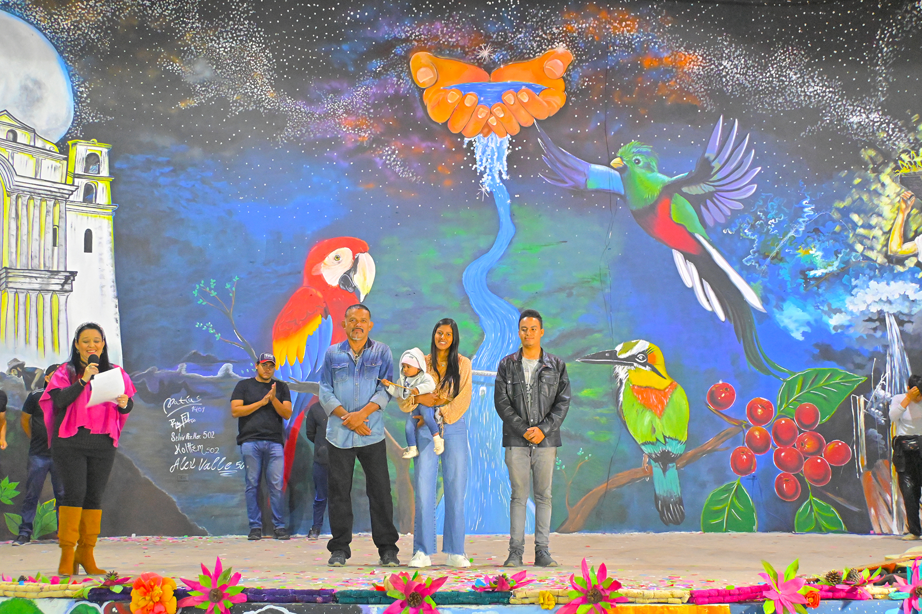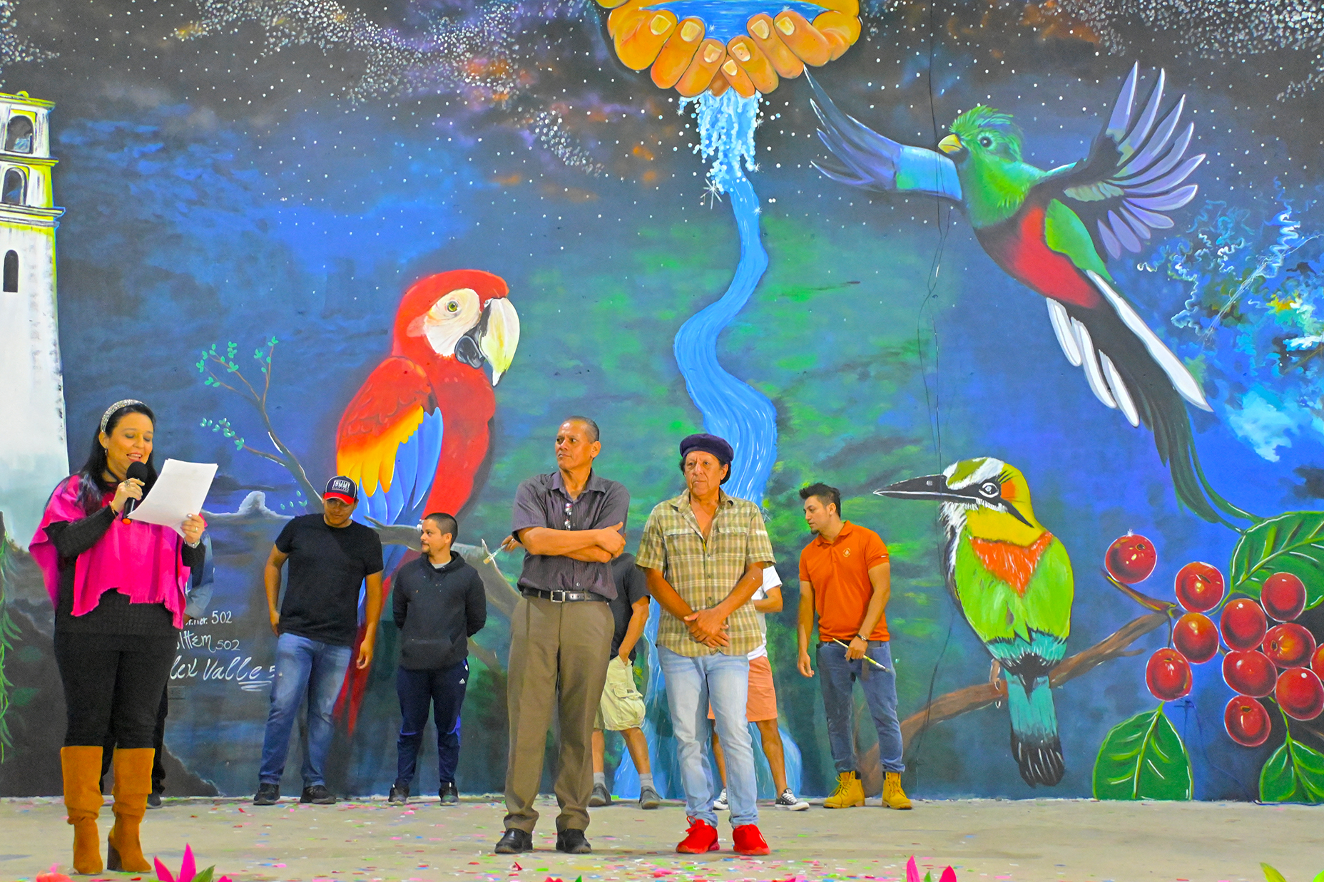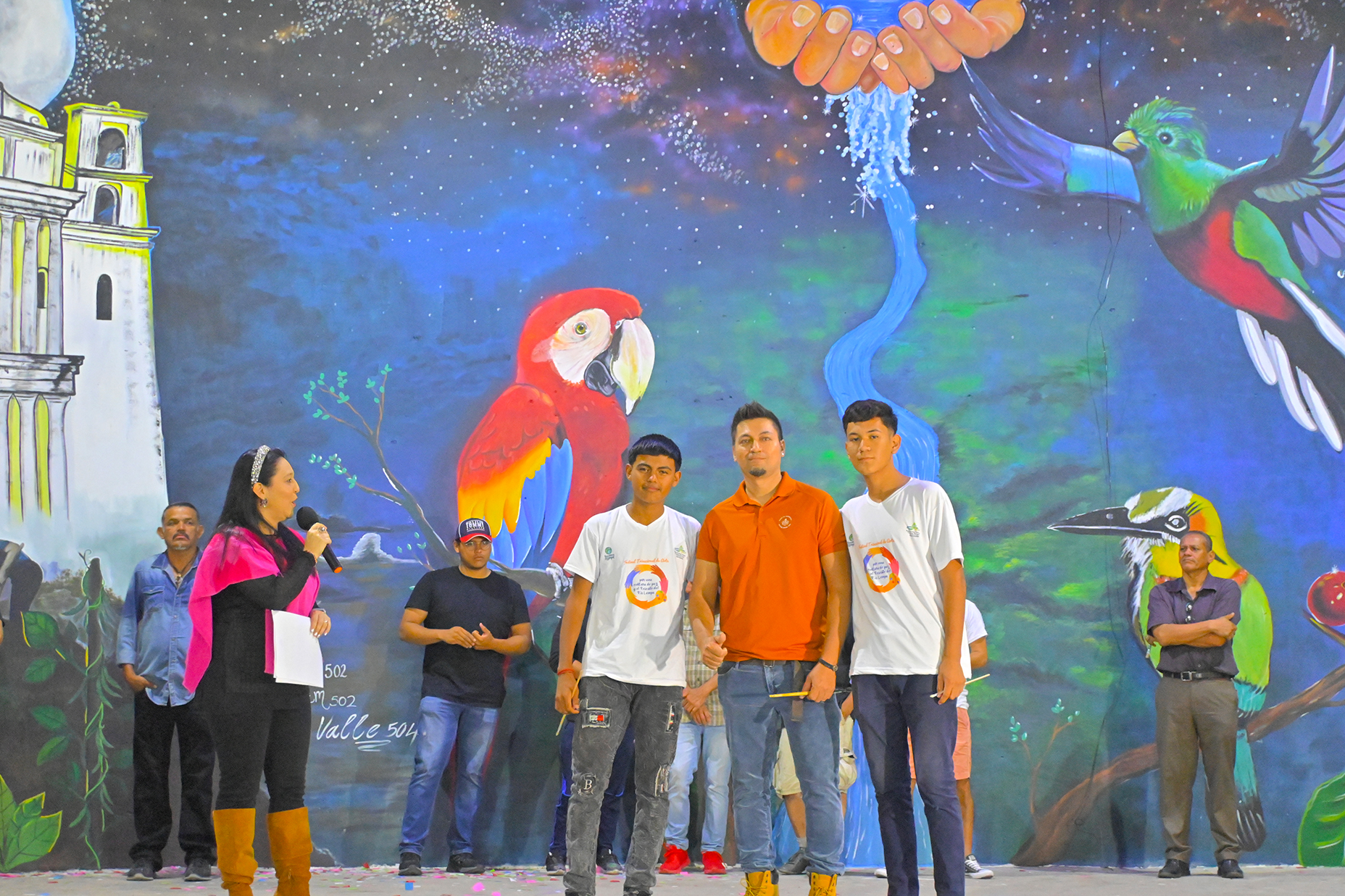 Los artistas fueron presentados uno a uno con la imagen elaborada en los diferentes espacios públicos, junto a pintores locales, estudiantes, miembros de comunidades y niños que participaron en la elaboración de los murales, a quienes se les entregaron diplomas de participación.