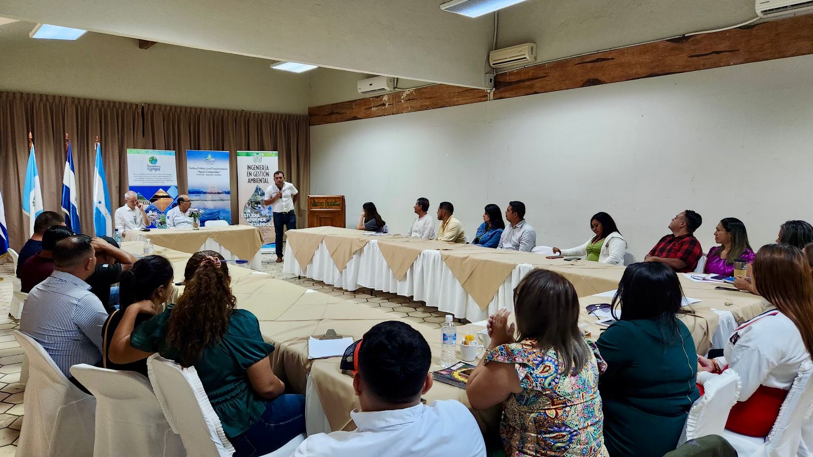 Sr. Eliú Leonardo Mejía, Coordinador Regional de la Universidad Pedagógica Nacional Francisco Morazán en Santa Rosa de Copán, Honduras; Sra. Claudia Paredes- Enlace de la Municipalidad de Esquipulas; Sr. Héctor Alonso Aguirre, Gerente General de la Mancomunidad Trinacional Fronteriza Río Lempa y Dr. Xavier Mínguez, docente de la Universidad de Valencia.